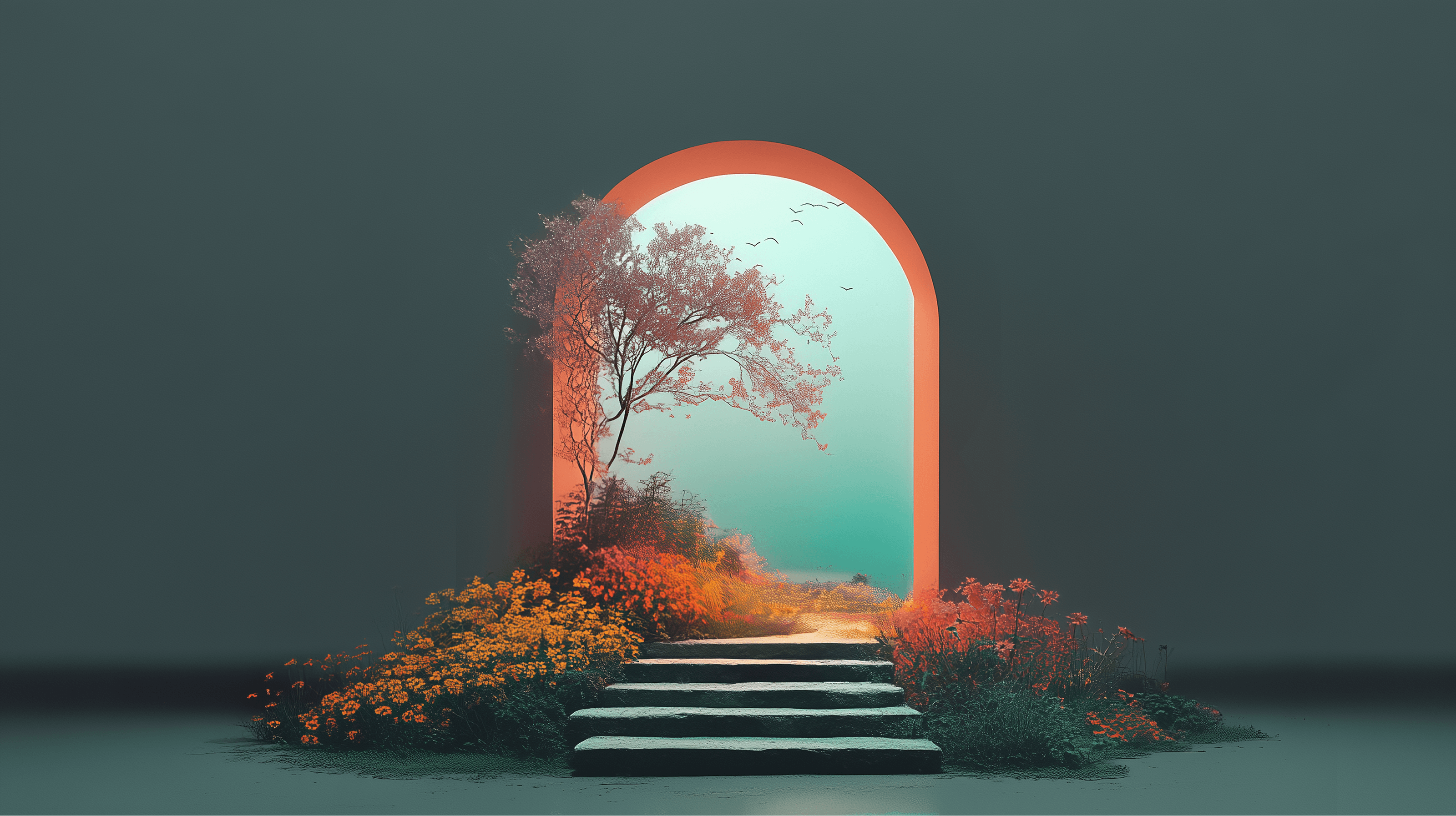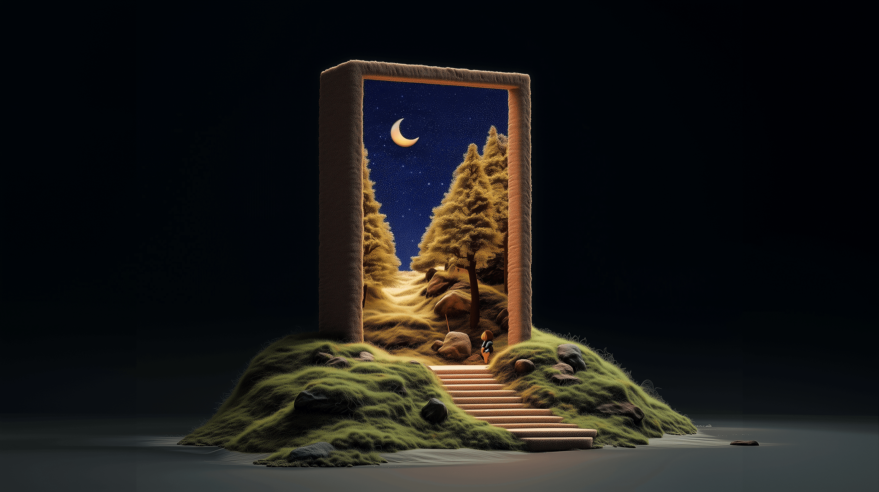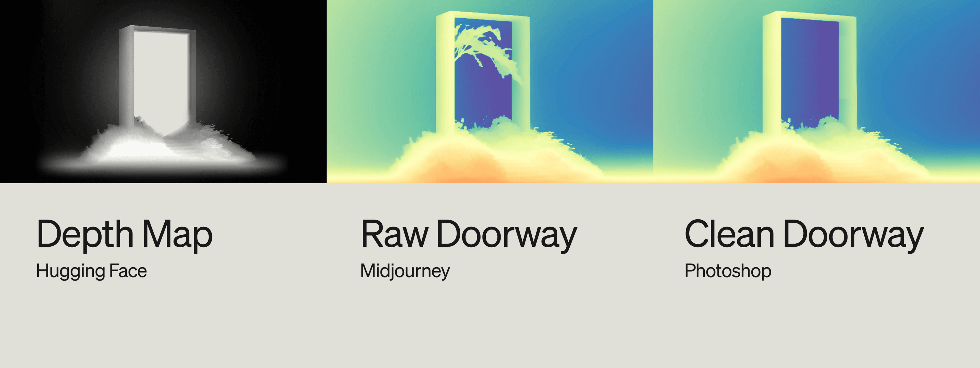 AI tools are evolving constantly—by the time you read this, there’s probably a better way. Here’s how we did it: find or create a reference image for the “world” behind the doorway, then use MidJourney’s Edit mode to layer the doorway on top. Next, we cut out the areas outside the doorway, letting MidJourney blend the scenes smoothly. Once the image’s right, we use it as a style reference and retexture to build from there.