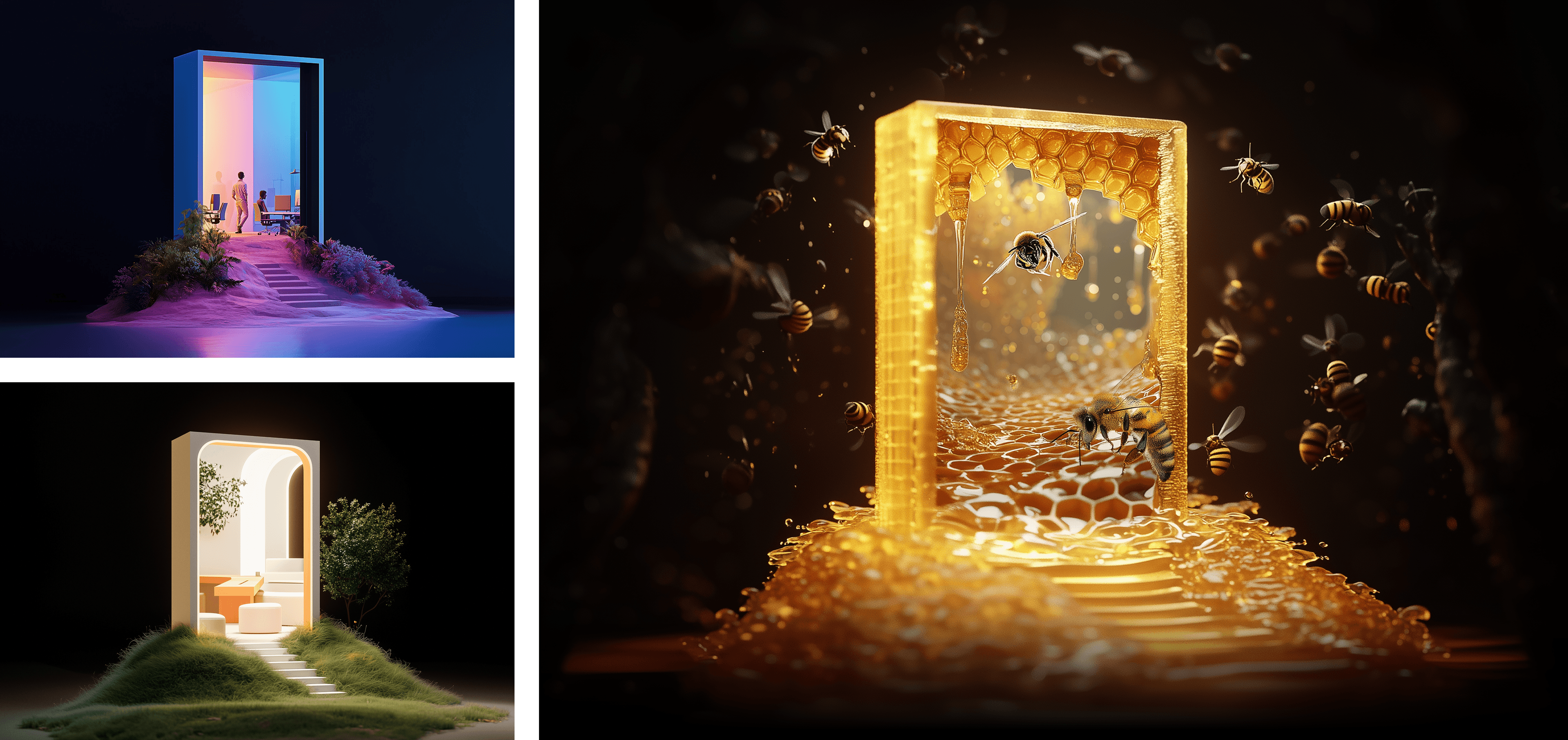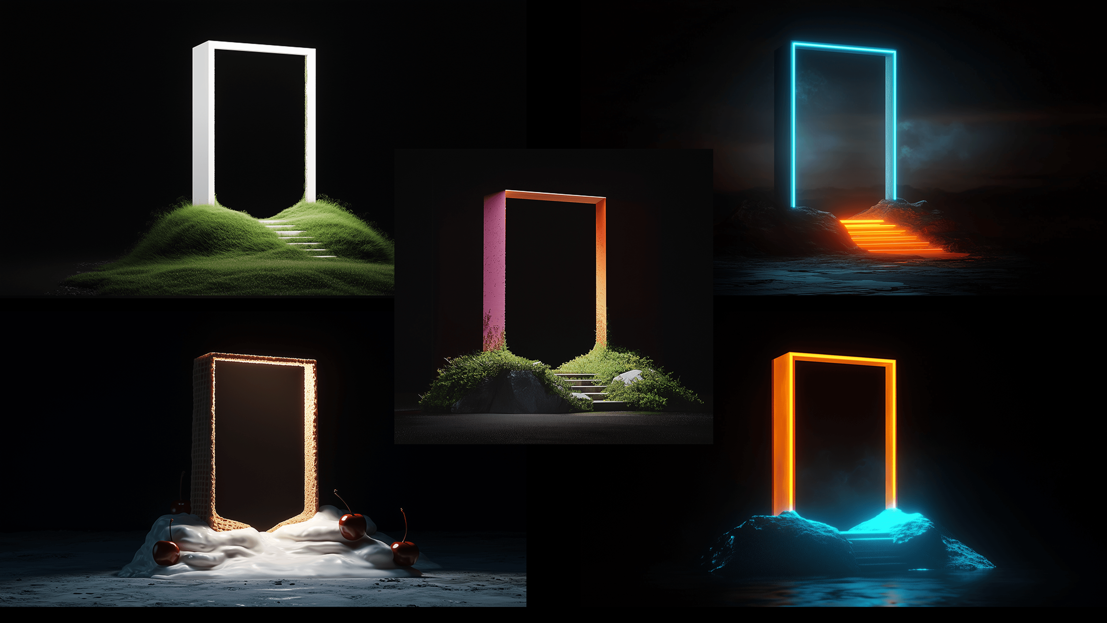 Once we had clear concepts for each portal, we didn’t rush into final production. Instead, we ran a wide range of visual studies—not to nail things perfectly right away, but to stay curious. Different materials, lighting, and metaphors—sometimes pushing ideas farther than we’d end up going. This is where AI really proved itself. It lets you explore without locking into one direction too soon.