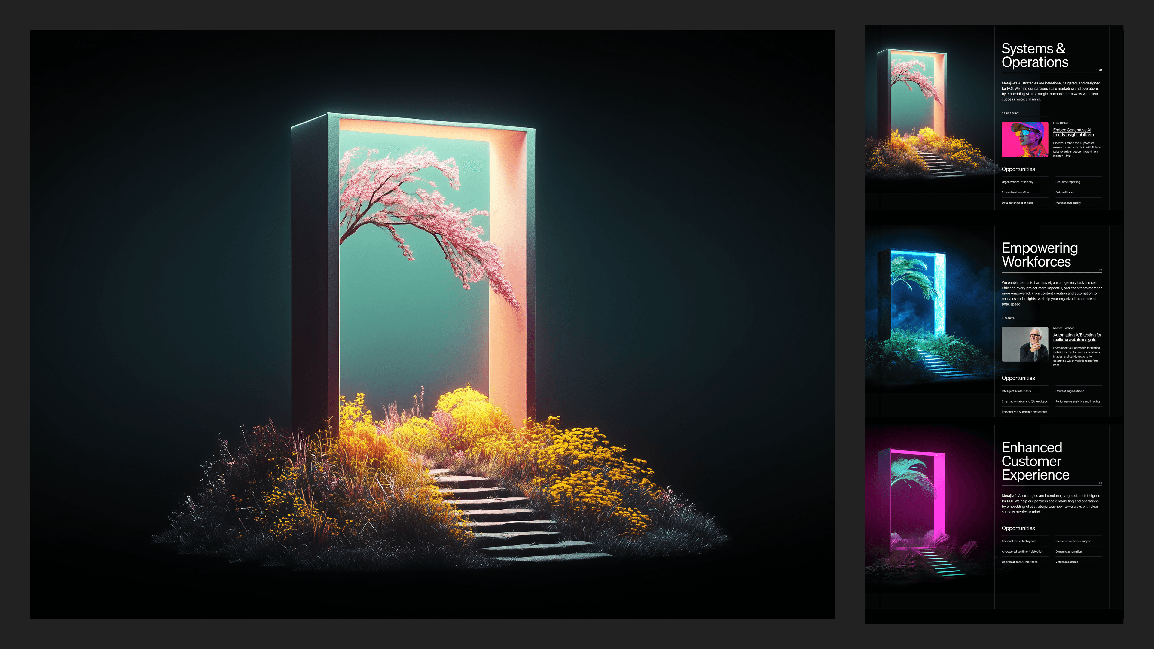 Each portal world began with human ideation, not prompting. What does “systems” actually mean visually? What metaphors make workforce energy feel alive? How do you make customer experience feel both pragmatic and delightful?