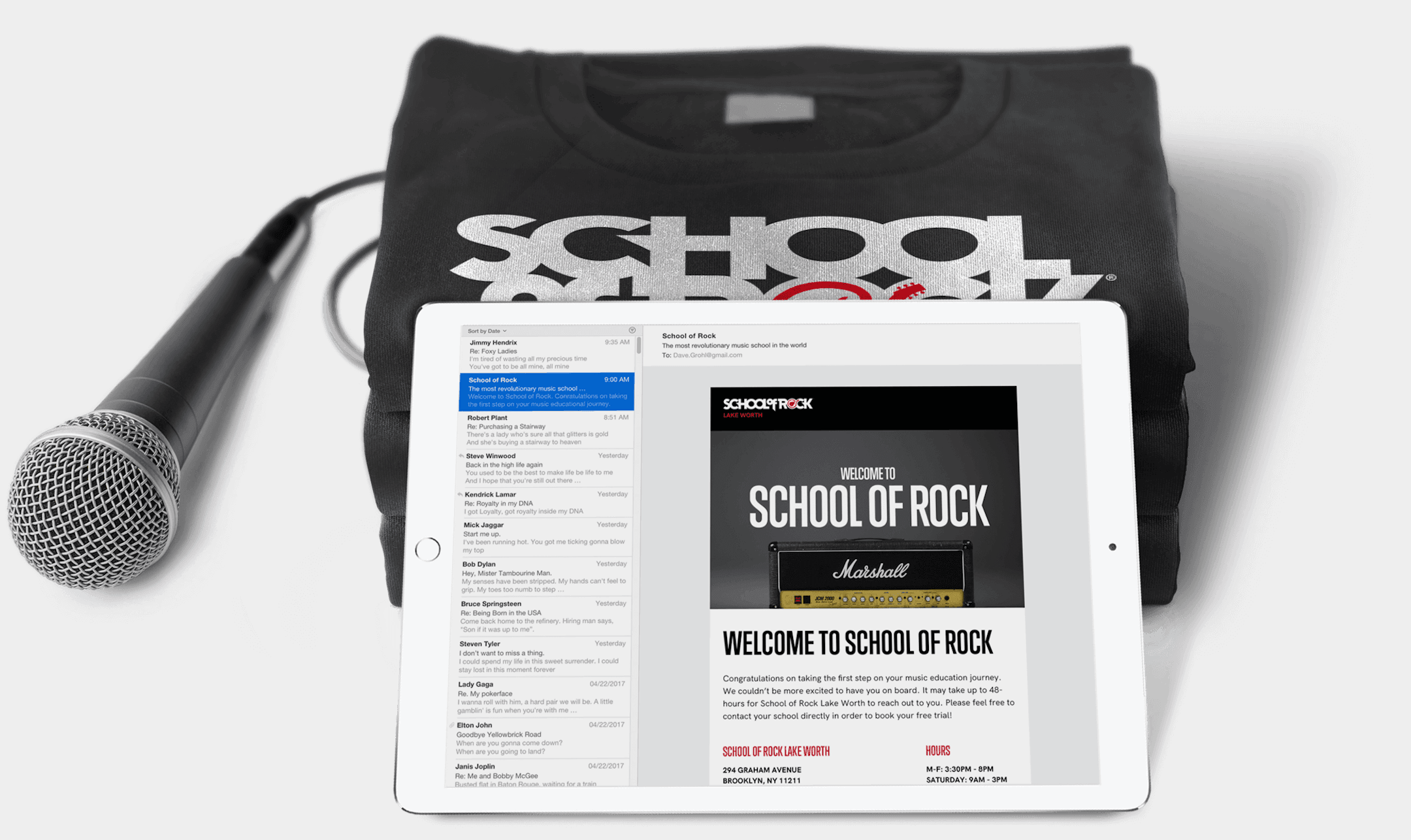 Folded School of Rock shirt with a microphone beside it and an ipad showing the School of Rock email campaign