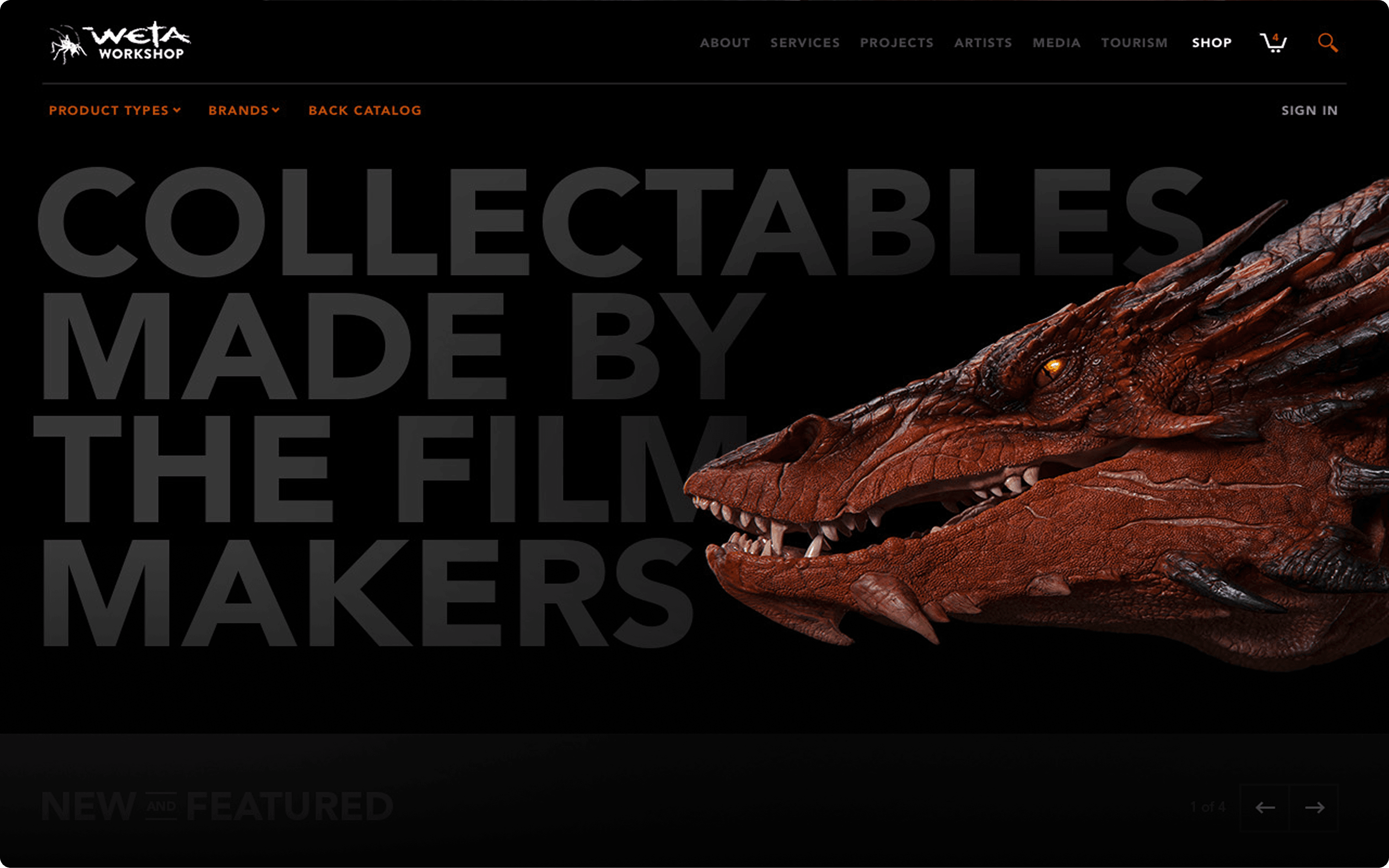 The homepage sets the stage with a cinematic feel, instantly spotlighting new films, standout products, and Weta’s signature brands. Every element is built to strengthen the link between Weta’s legendary film work and the collectibles fans love.