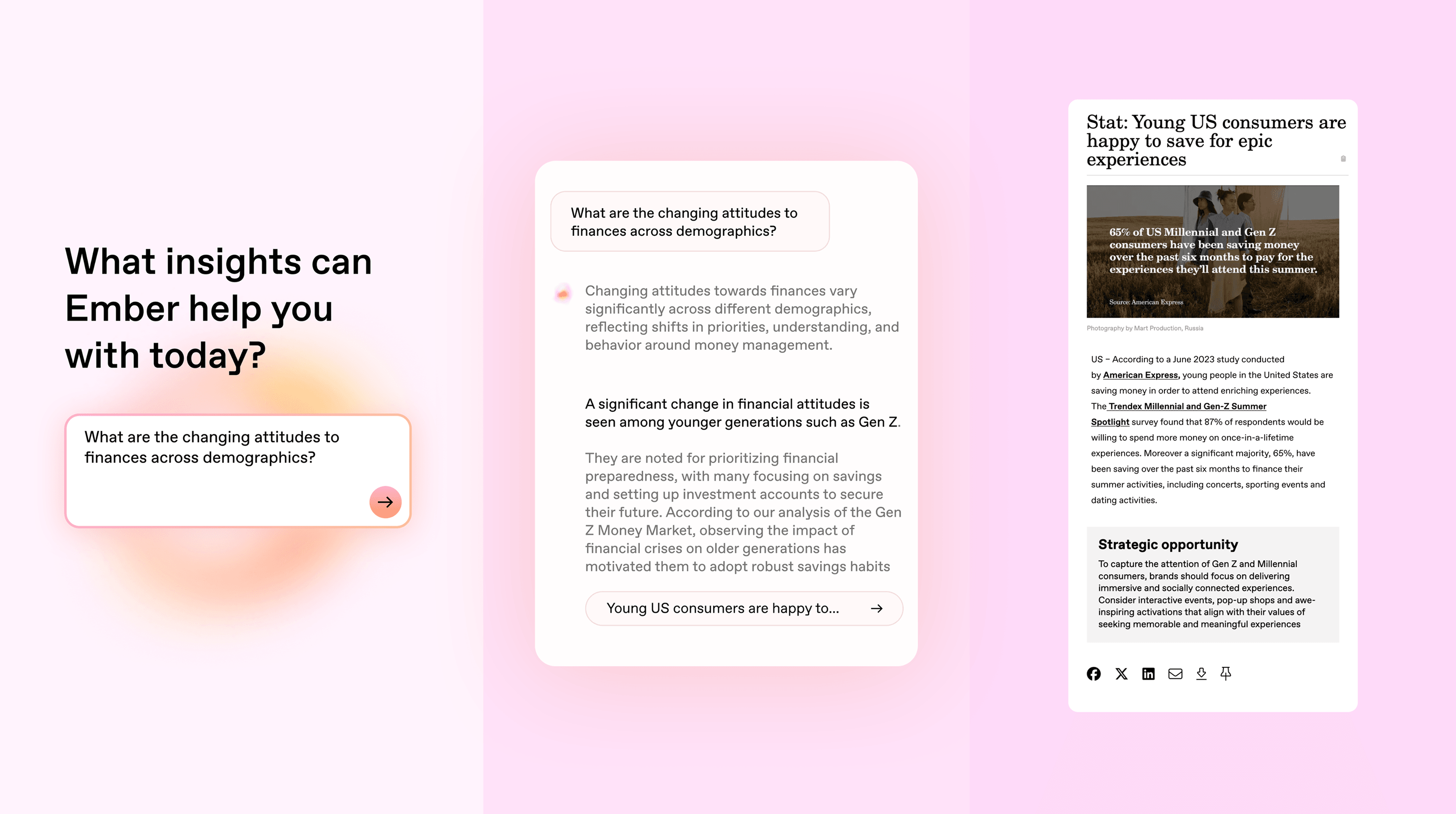 Our goal was to make Ember feel less like a search engine and more like a trusted research partner. We built features that surface unexpected connections across all content types, helping users spot insights they might otherwise miss. Every answer is crafted not just to inform, but to spark curiosity and lead users toward the full reports and articles that matter.