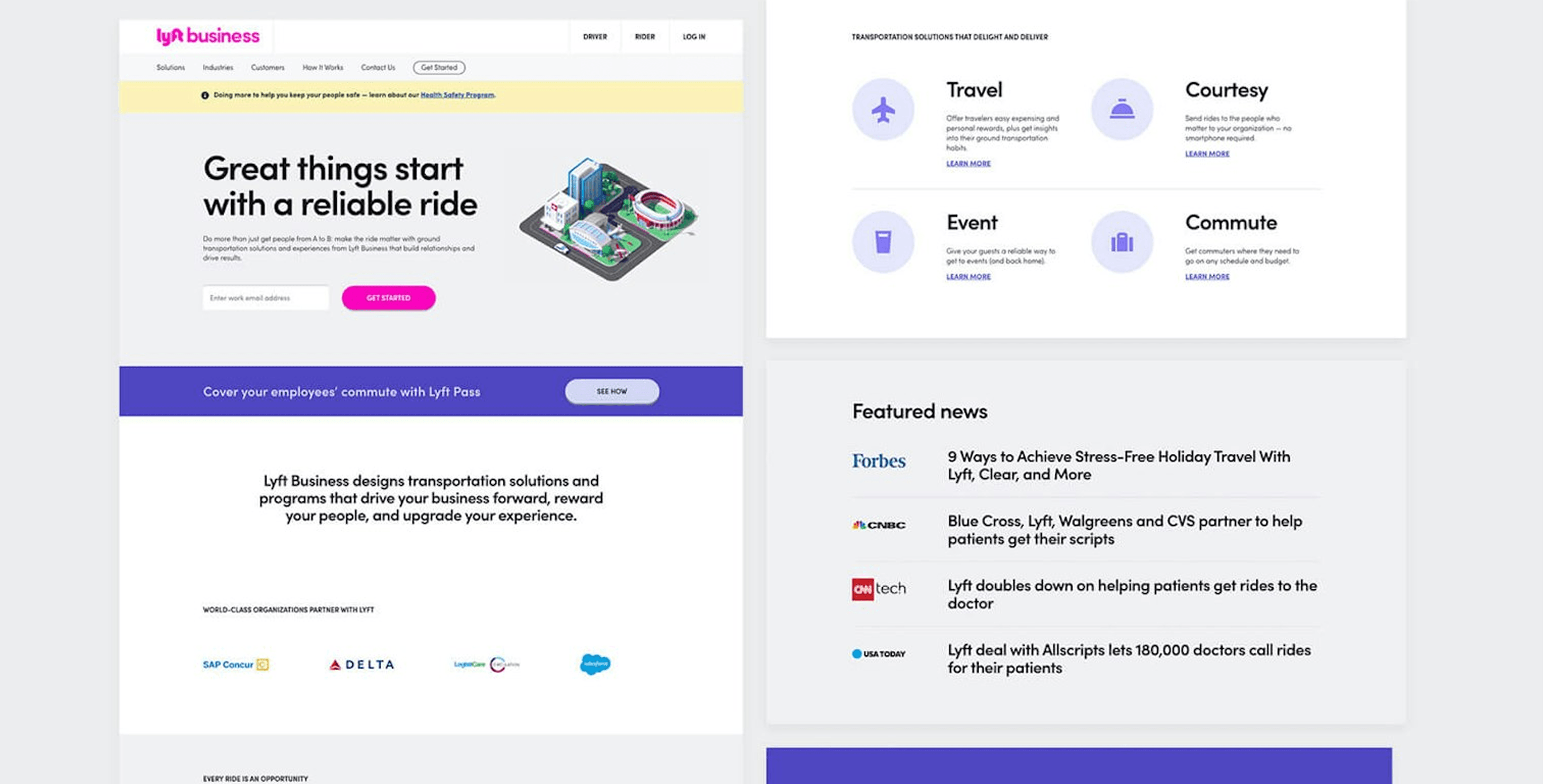 Lyft might lead the pack in ride-sharing, but the Lyft Business channel wasn’t in sync with the rest of the brand. Plus, its audience is all over the map—think hospitals, the Hollywood Bowl, Fortune 500s, airports, and more. We had to create a clear, tailored journey for each group, all while making sure the site finally felt on-brand.