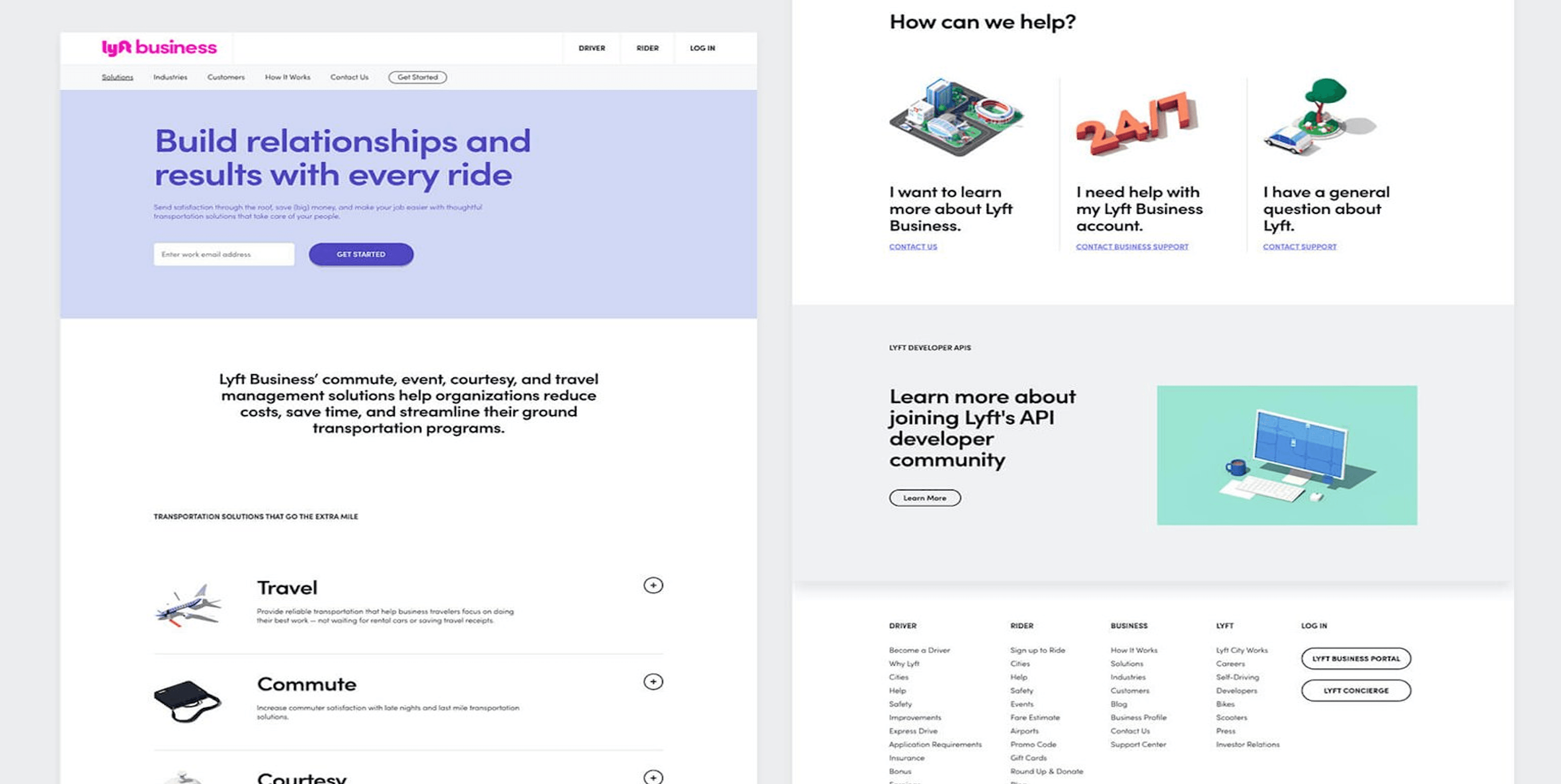 Building on Lyft’s refreshed brand colors, we crafted a unique visual identity for the Business channel that still nodded to the core brand guidelines. We pushed the main site format further, creating a robust library of custom modules to handle the site’s deeper, more complex content needs. Making sure everything felt unmistakably “Lyft” meant expanding and fine-tuning the visual language—so every new use case and audience felt right at home.