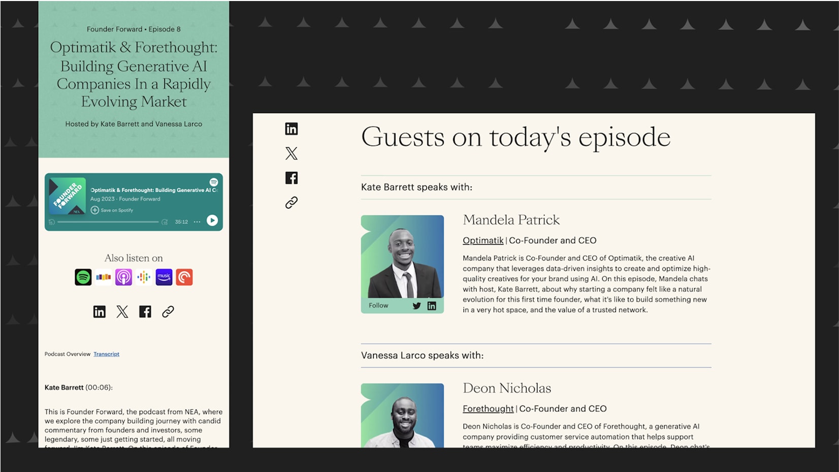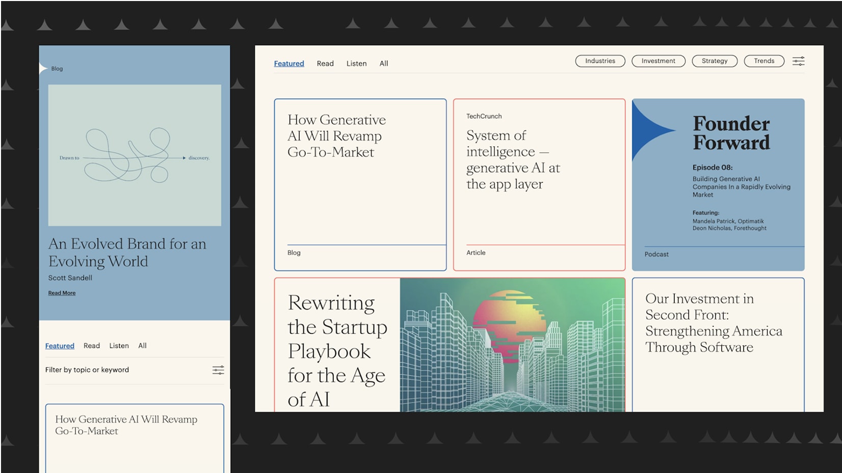 Consistent photography of NEA’s team and founders helped us put real faces to the brand and highlight their collaborative spirit. The design stays light and optimistic, but we introduced darker tones where it made sense—like switching to dark mode for the search experience, which made everything pop and feel even more usable.