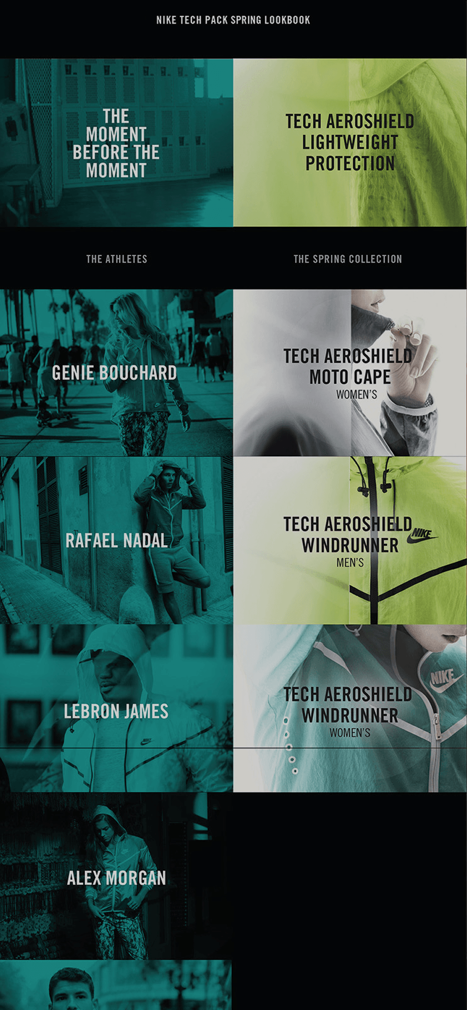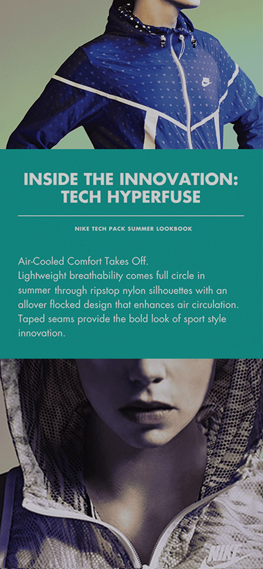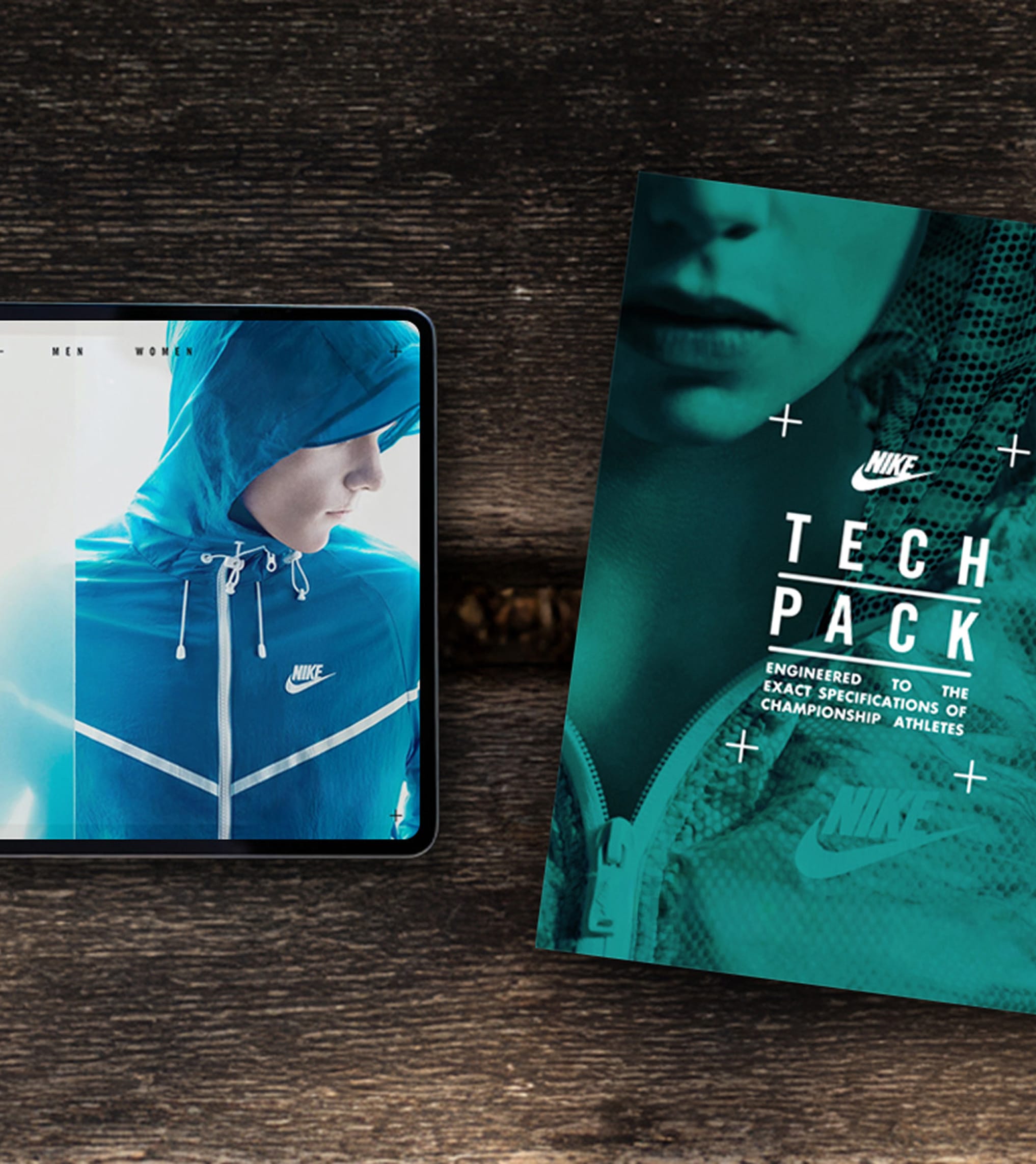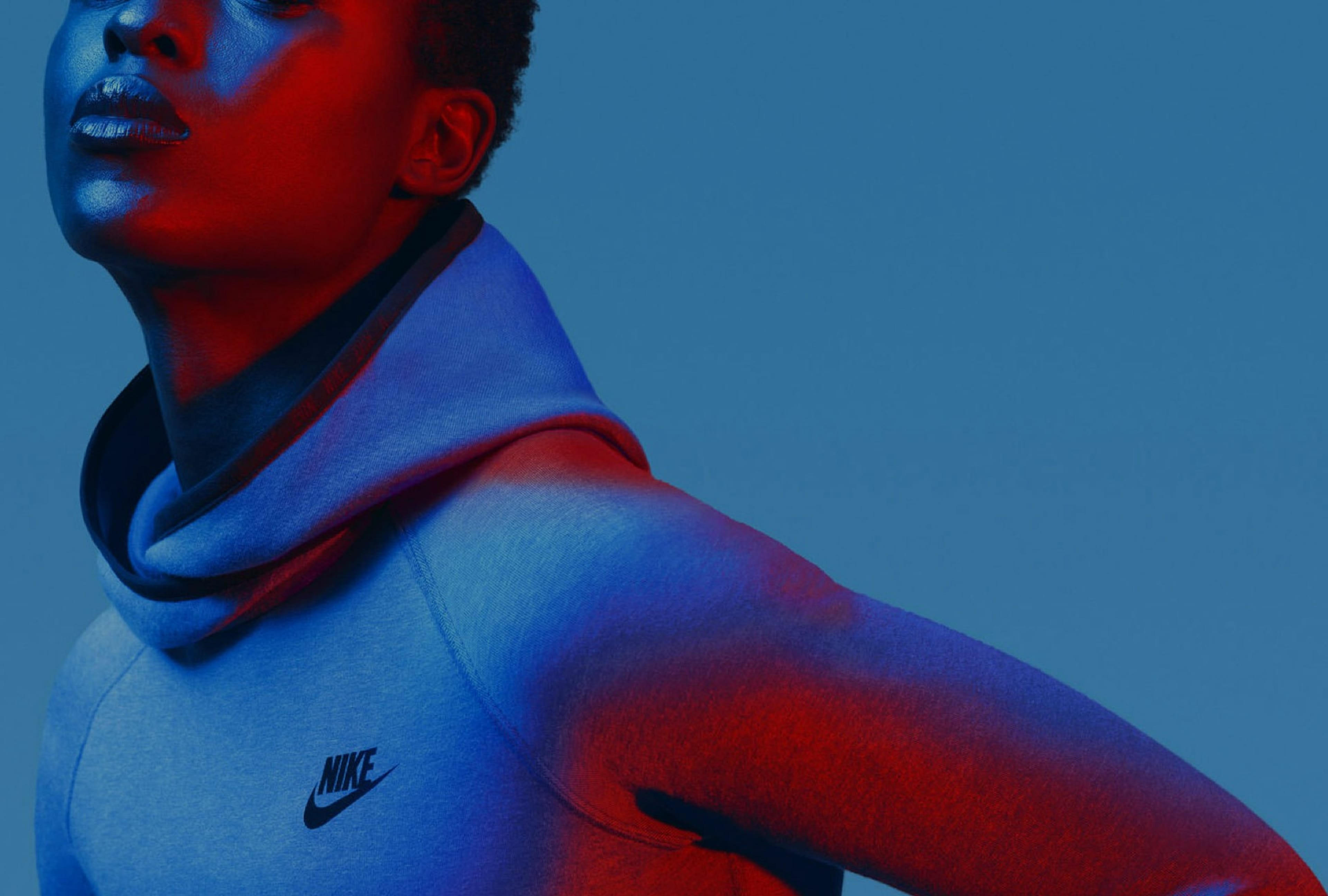 Photography featuring the Tech Pack line—worn by the world’s top athletes—used striking contrast and sharp focus to make every product stand out with unmistakable, aspirational energy.